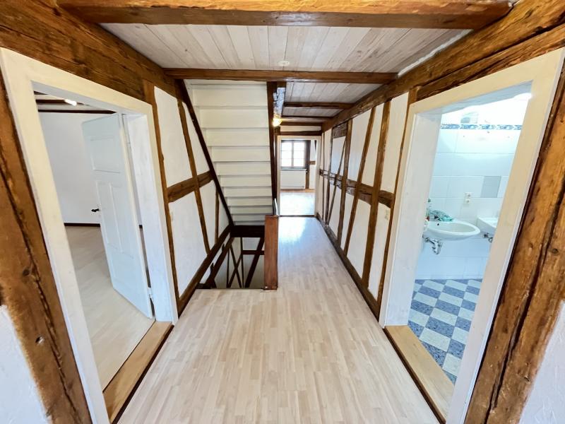 Dieses besondere Haus hat historischen Charme und bietet viel Gemütlichkeit. Es wurde zwischen ca. 1990 und ca. 2000 umfassend saniert und modernisiert. Die freundlichen, sehr geräumigen Zimmer haben freigelegtes Fachwerk/Deckengebälk und weiß verputzte Wände. Die Ausstattung ist einfach, der Zustand des Hauses insgesamt gut und gepflegt. Diverse Renovierungen und Modernisierungen sind erforderlich (u. a. teilweise Modernisierung der Bäder). Durchgeführte Modernisierungen ca. 1990 - ca. 2000 - Erneuerung der Dacheindeckung (mit Biberschwanz-Ziegeln) und Isolierung des Daches - Erneuerung aller Fenster - weitgehende Erneuerung der Strom- und Wasserinstallationen - Renovierung Fachwerk und Dachgebälk (im Innenbereich) |